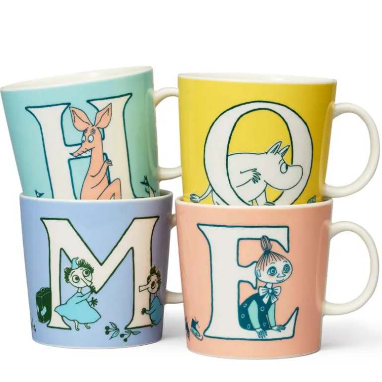 MoominArabias ABC-kolleksjon med bokstavene L, O, V og E danner ordet LOVE. Mummikopp M og Mummikopp H gjør at man også kan stave HOME. Mummi ABC koppene er i en større størrelse på 0,4 L, sammenlignet med den klassiske størrelsen på som er 0,3 L. Denne mummikoppen er en stor versjon som passer perfekt til kaffe eller te. Den passer også utmerket å servere dessert i!