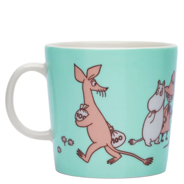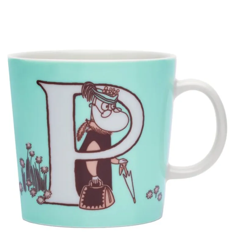 Turkis mummikopp P 40 cl fra ABC-serien til MoominArabia. På P-koppen sender Mummitrollene en pakke med stygge ord til tante Jenny som en spøk. Jenny blir rasende, og hun bestemmer seg for å besøke dem. Hun bestikker Sniff med penger for at han skal avsløre hvor Mummitrollene befinner seg. Denne sjarmerende illustrasjonen er basert på serien «Mummitrollets familie» og formidler en følelse av eventyr og fellesskap.