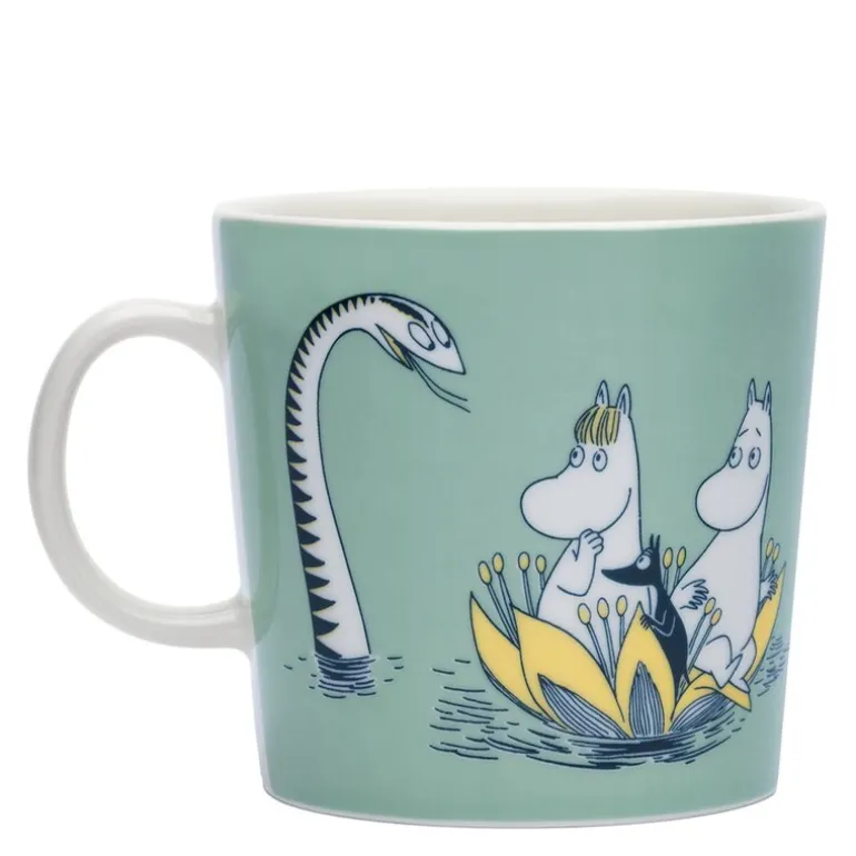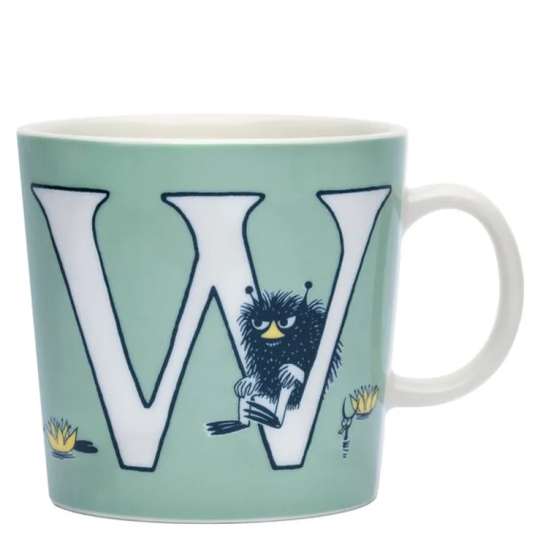 Grønn mummikopp W 40 cl fra ABC-serien til MoominArabia. På W-koppen har Mummidalen blitt omgjort til en jungel, og Stinky har sluppet løs dyrene fra dyrehagen. Men Stinky har alltid en plan! Han lurer Snorkfrøken og Mummitrollet til å komme og se kjempestore liljer – men i stedet møter de en kjempestor slange!