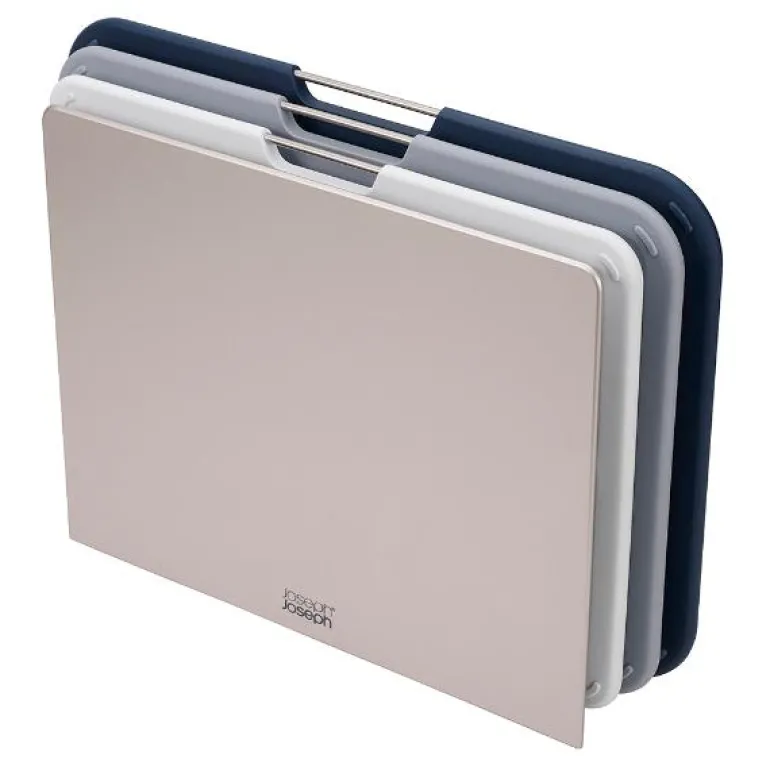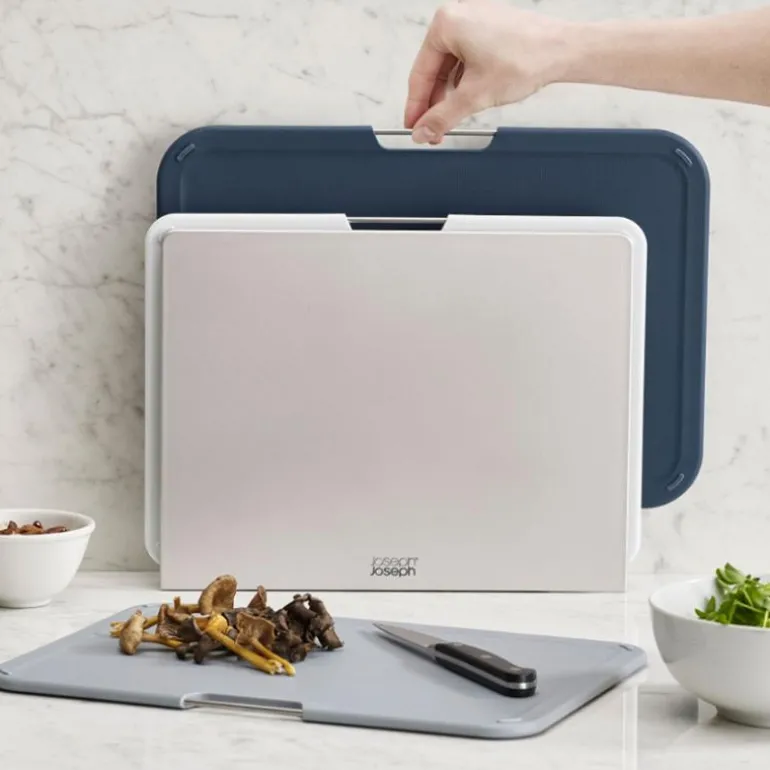 Dette settet med tre fargekodede skjærebrett i et elegant stativ fra Joseph Joseph. Med hvert skjærebrett utstyrt med et håndtak i børstet stål, er det enkelt å løfte dem ut av stativet etter behov. Stativet sørger for at hvert brett holdes separat, slik at luften kan sirkulere og bidra til jevn tørking etter rengjøring.