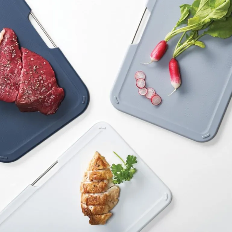 Alle skjærebrettene er utformet med hjørner som forhindrer dem i å skli på benken, og de har knivvennlige kutteflater som beskytter knivene dine samtidig som de gir enkel og presis kutting av ingrediensene dine. Laget av holdbare materialer som PP og ABS plast, sammen med TPR anti-skli i hjørnene, sikrer at brettene er slitesterke og stabile.