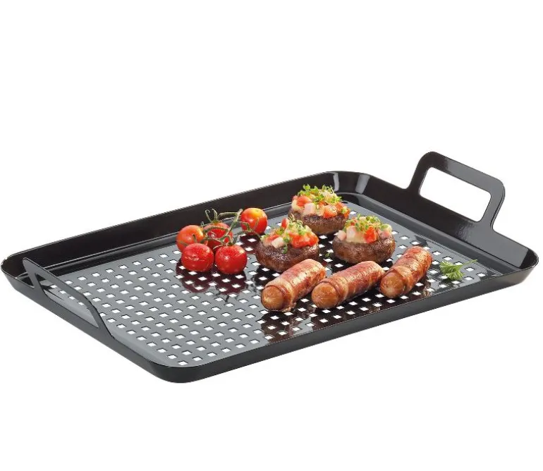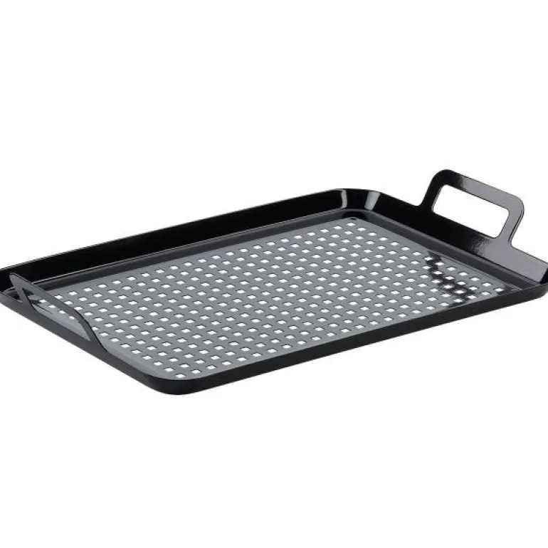 NEVADA-grillbrettet er laget av stål med sort emalje som gjør at det fremstår eksklusivt, men det tar ikke noe fra selve funksjonen til produktet. Grillbrettet er perfekt hvis du ønsker grillsmaken av grønnsaker og fisk, som ofte er for liten eller fin til å kunne ligge på en vanlig grillflate. Åpningene i bunnen sørger for optimal varmesirkulasjon. Pannen har håndtak for enkel transport og måler 40 x 25 x 2 cm.