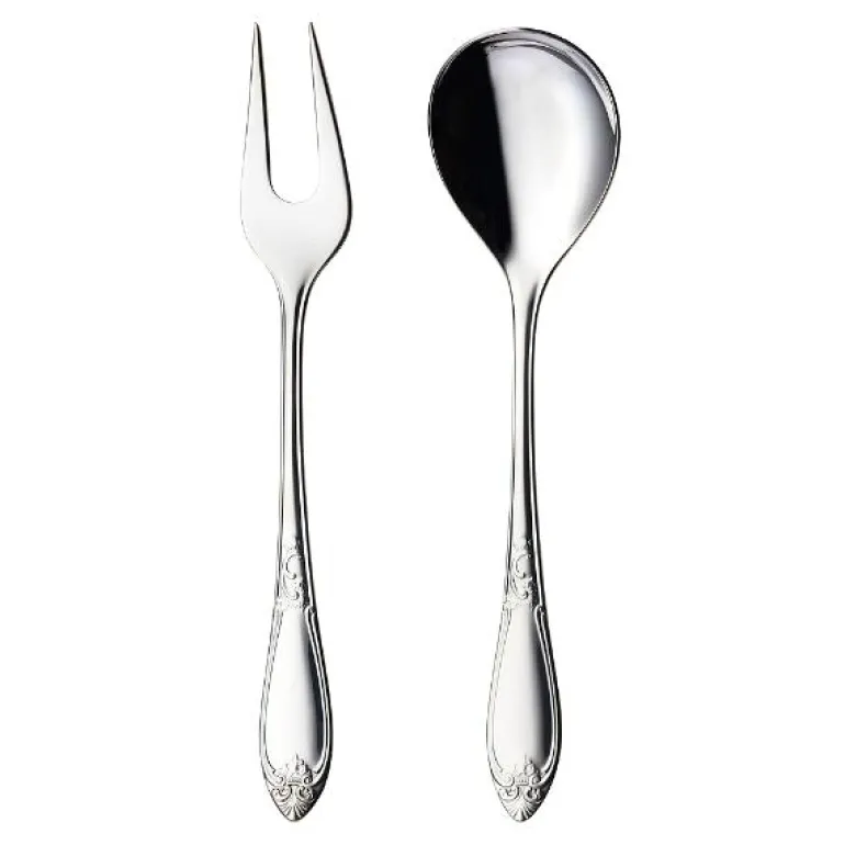 Serveringssett 2 deler i den elegante, høytidlige Nina-serien fra Hardanger Bestikk. Bestikket er feminint, elegant og høytidelig med utskjæringer inspirert av rosemaling. Serveringssettet inneholder en serveringsskje og en serveringsgaffel med gripevennlige håndtak og god dybde. Settet komplementerer hverandre for sømløs servering. Lange tinder på gaffelen gjør den godt egnet for å håndtere kjøtt. Stålet som er av 18/10 rustfritt stål tåler oppvaskmaskin, og produktet har livstidsgaranti. Serveringssett 2 deler leveres i gaveeske, og inneholder;