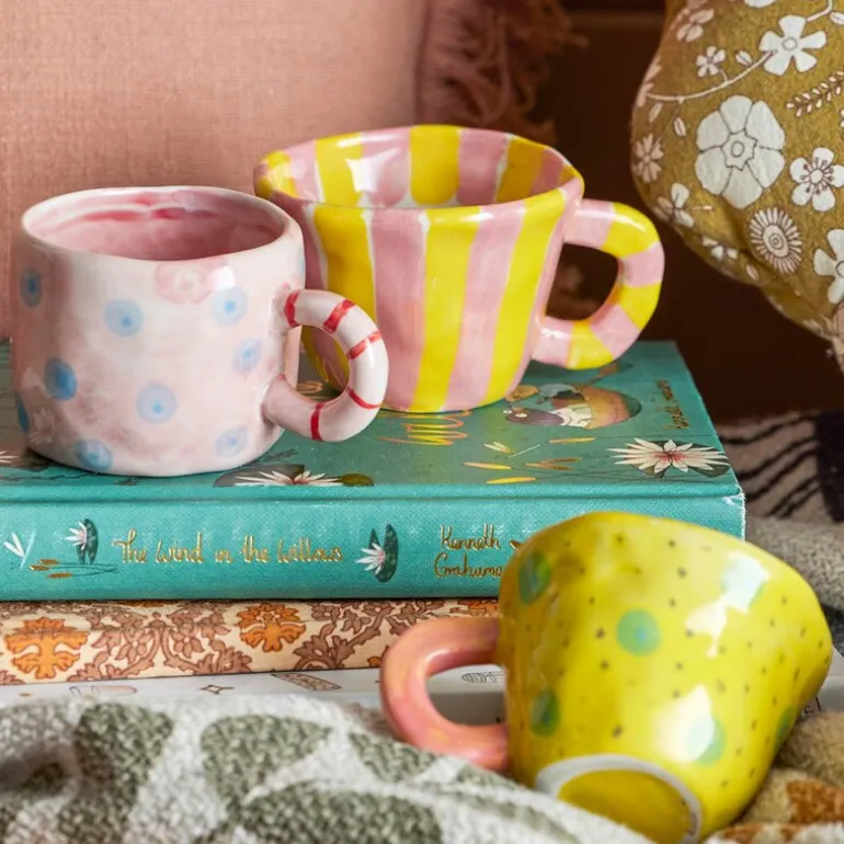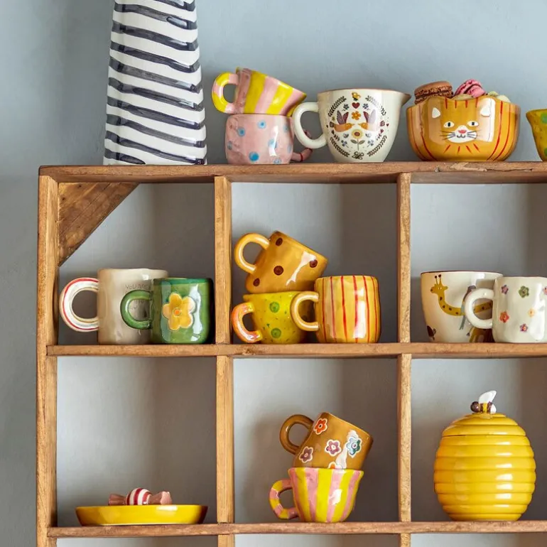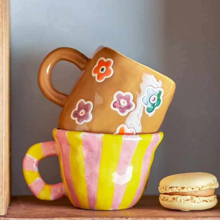 Nini krus 10 cl i rosa/gul fra Bloomingville MINI er laget i steintøy og har et lekent designet uttrykk med striper i glade farger. Kruset passer like godt til barnas lekekjøkken som til ekte drikke. Den kompakte størrelsen gjør det ideelt for små hender.