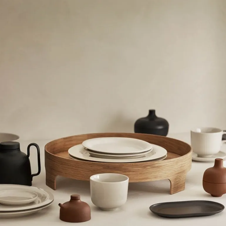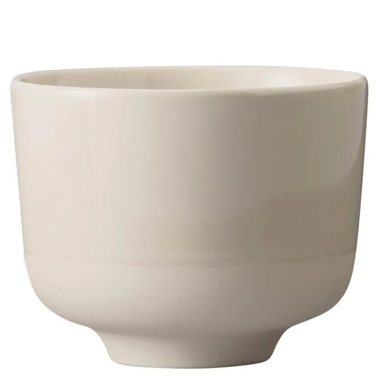 Serviset er laget av kraftig brent steingods i en myk og sandaktig fargetone uten noen synlig finish, slik at maten som serveres er eneste dekorasjon. Den matte strukturen fremhever lysspillet i flatene, og steingodset er full- eller halvglasert med et transparent uttrykk.