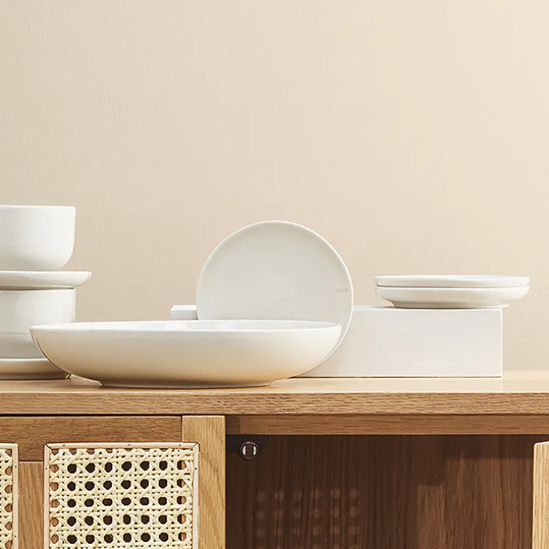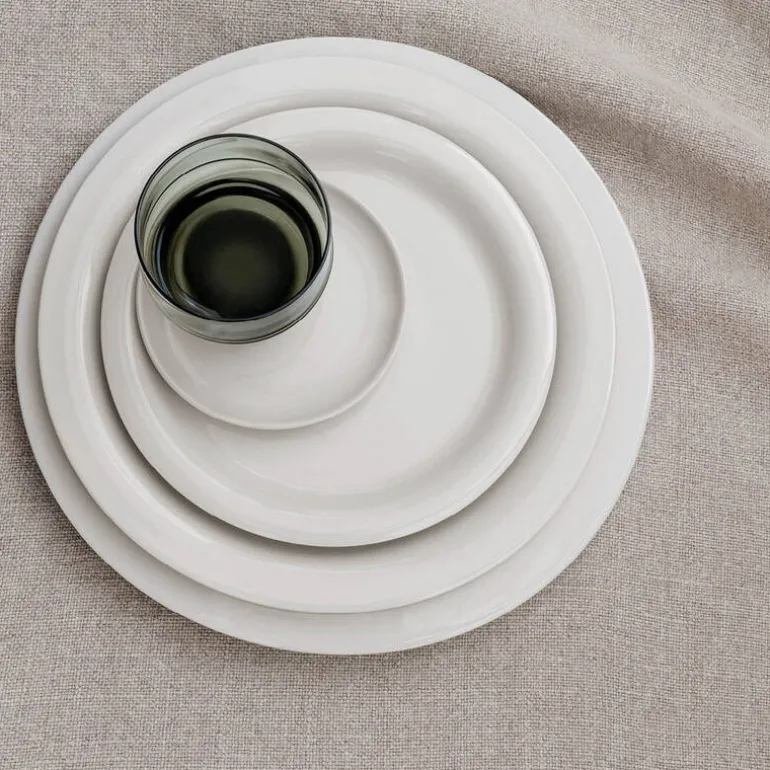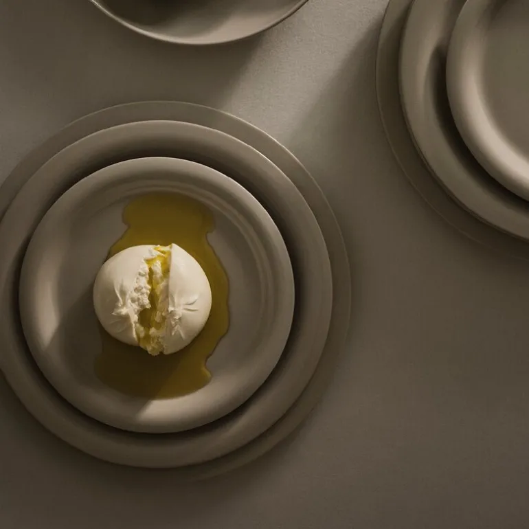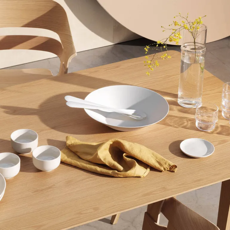 Serviset er laget av kraftig brent steingods i en myk og sandaktig fargetone uten noen synlig finish, slik at maten som serveres er eneste dekorasjon. Den matte strukturen fremhever lysspillet i flatene, og steingodset er full- eller halvglasert med et transparent uttrykk.