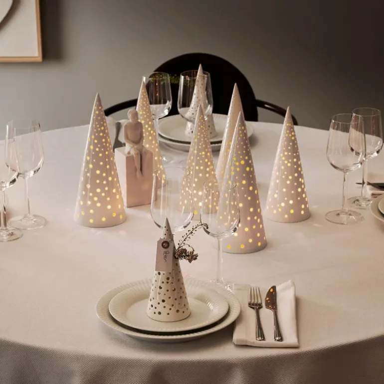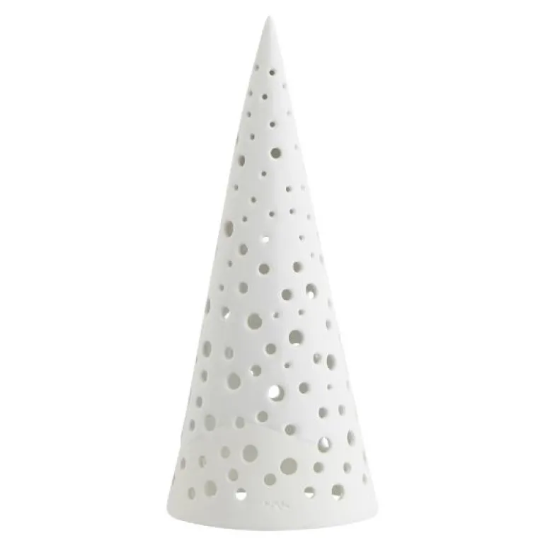 Nobili er Kählers serie av klassisk julepynt i keramikk, inspirert av de nordiske vinterskogene, der stjernene glimter i den myke, hvite snøen som innhyller trær, bakker og bekker. La de vakre Kähler-juletrærne fra Nobili-serien bringe varme og hygge med sine unikt utskårne hull ? uansett hvor de plasseres. Bruk denne 18cm høye Nobili-telysholderen alene eller sammen med de andre størrelsene.