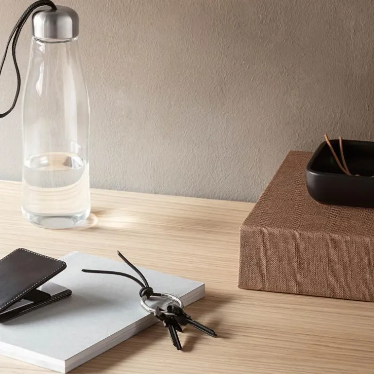 Svart nøkkelring fra Eva Solo kombinerer stilrent design med praktisk funksjonalitet. Med sine mål på 10 x 3,8 cm passer den godt i hånden og er enkel å ha med seg i hverdagen. Nøkkelringen er laget i rustfritt stål og har en elegant lærstripe som gir et eksklusivt preg.