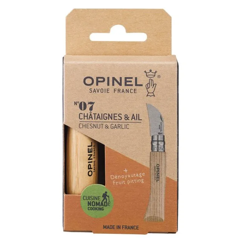 Nomad N07 kastanje-/hvitløkskniv fra Opinel er en liten, presis og svært nyttig lommekniv for kjøkken og friluft. Det 4 cm korte fuglenebbformede bladet i rustfritt stål gjør det enkelt å skjære og skrelle kastanjer, hvitløk eller fjerne steiner fra frukt som plommer og kirsebær – perfekt til syltetøy og paier.
