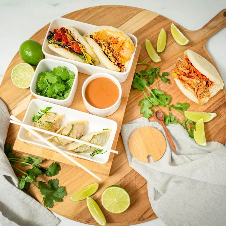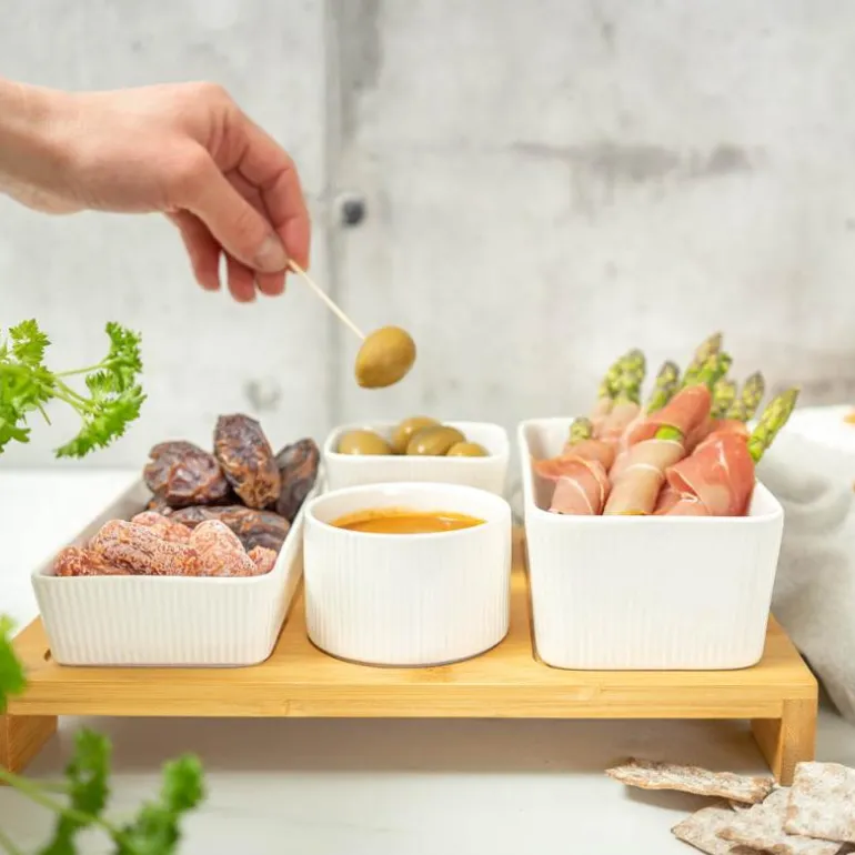 Nor tapassett i 7 deler fra Modern House. Tapassettet med stilrent og rillet design, består av 4 forskjellige skåler i porselen som er perfekte til servering av tapas, varmretter, snacks, frukt og grønt. Bambusbrettet gjør det lett å servere, samtidig som det beskytter bordet om du serverer varmretter i skålene.