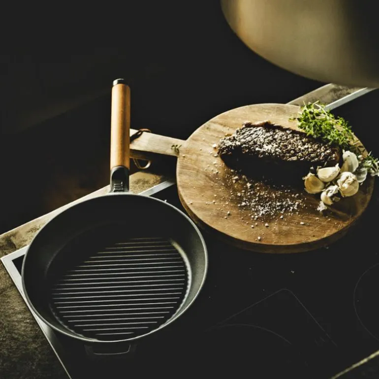 Inspirert av nordisk natur og tradisjoner. Støpejern holder ekstremt godt på varmen noe som gjør stekepannene perfekte til bruning av mange ulike typer råvarer. Det unike mineralske Thermium-belegget gir produktet suverene non-stick egenskaper selv ved meget høye temperaturer, samtidig som det er mye enklere å rengjøre. Tredetaljene i finsk varmebehandlet bjørk kan fjernes under bruk, og brukes som gryteunderlag. Designet i Finland.