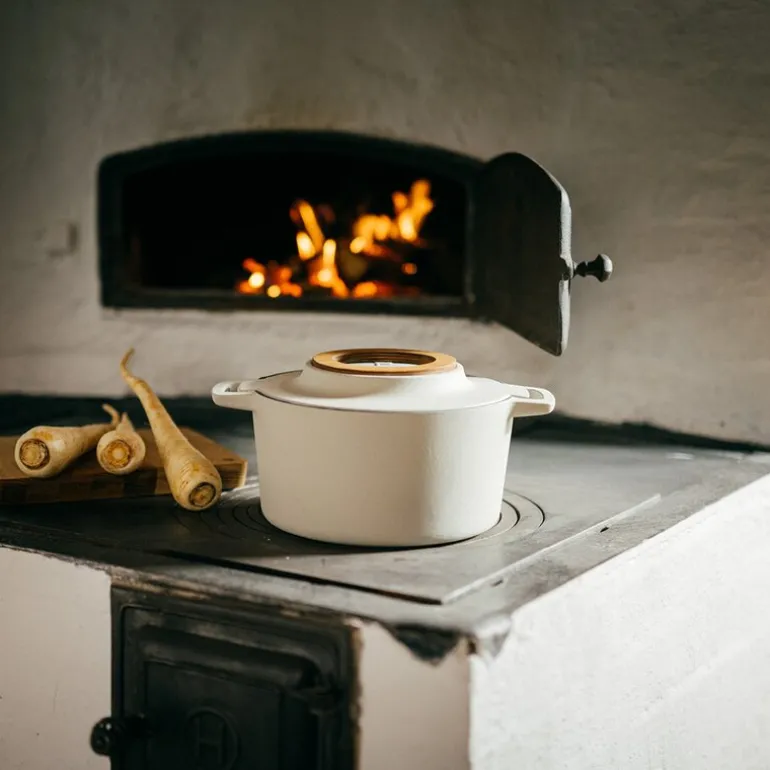 Gryten kan brukes på alle koketopper, inkludert induksjon, og kommer med et praktisk underlag i finsk bjørk. Den tåler også temperaturer opp til 270 °C, enten på komfyren eller i ovnen. Husk å fjerne trefoten før ovnsbruk for å beskytte treverket. For å bevare kvaliteten over tid anbefales det håndvask.