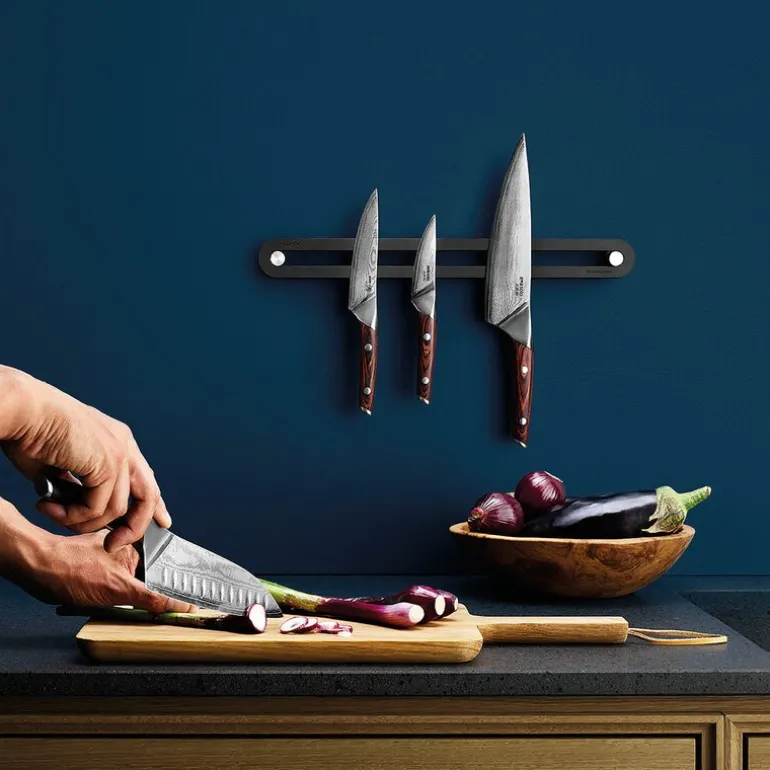 Nordic Kitchen kokkekniv 20 cm fra Eva Solo. Nordic kitchen-knivene er resultatet av en gjennomtenkt designprosess inspirert av japanske tradisjoner. Knivbladet er laget av japansk damaskusstål (AUS 10) og består av hele 67 lag, noe som gir knivene enestående skarphet kombinert med fleksibilitet. Med en japansk vinkel på 13-15° på hver side, gir bladet maksimal presisjon uten å kompromittere holdbarheten. Den smale ryggen på bladet gjør det enkelt å skjære gjennom ulike matvarer, selv om det anbefales å unngå frysevarer og ben for å bevare skarpheten.
