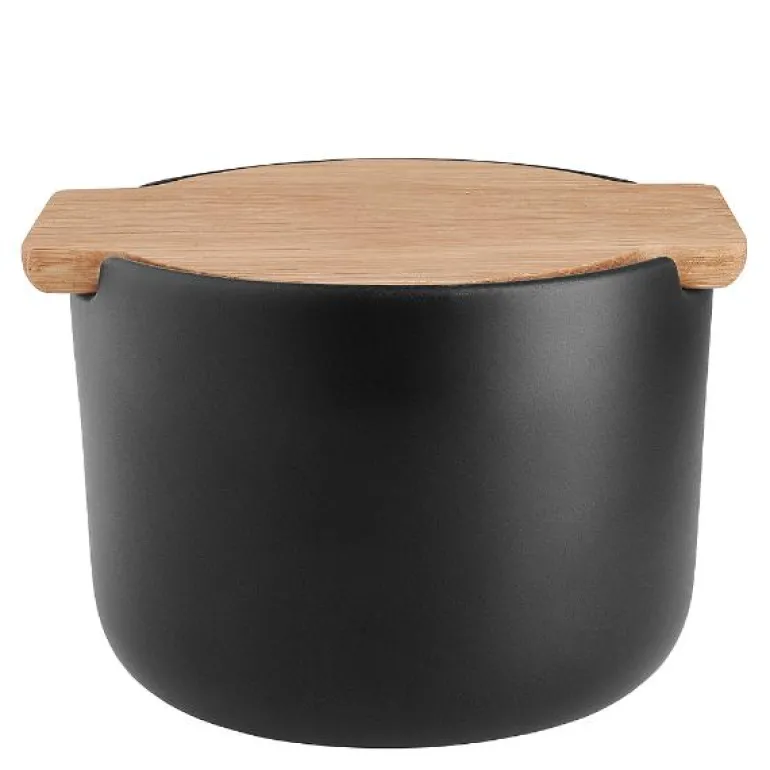 Nordic kitchen saltkar med løst lokk i oljebehandlet eik har et delikat design som kan stå fremme også når det ikke er mat på bordet. Lokket har en hygienisk og praktisk funksjon som sikrer at det ikke kommer stekeos i saltet. Karet kan også brukes til oppbevaring av f.eks. krydder eller mindre gjenstander som smykker. Karet tåler oppvaskmaskin, men lokket må vaskes opp for hånd. Lokket vedlikeholdes med regelmessig oljebehandling.