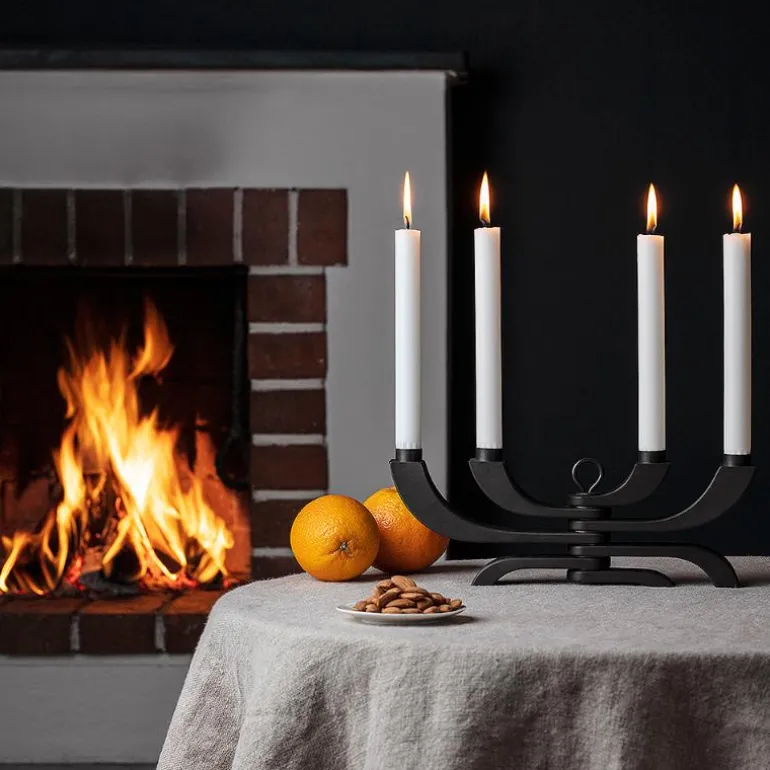 Firearmet lysestake Nordic Light svart, fra Design House Stockholm. Lysestaken har blitt et designikon takket være sin enkelthet og fleksibilitet. Armene kan svinges ut i til den formen som du selv ønsker. Designeren bak lysestaken, Jonas Grundell har kombinert glatte treoverflater og matt lakk med en svart jernløkke som binder de forskjellige delene sammen. Når lysene har brent ned, kan man svinge sammen lysestaken, som da tar opp et minimum av lagringsplass.