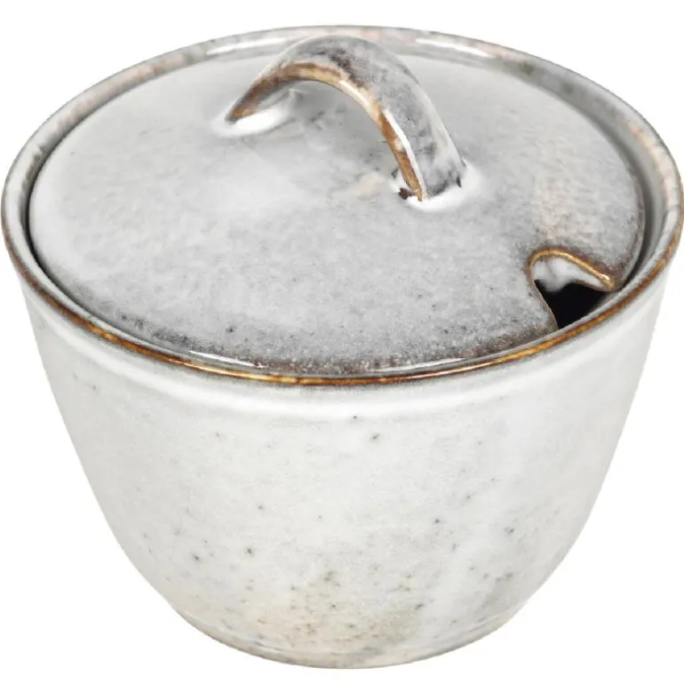 Sukkerskål med lokk 10,5 cm, i Nordic Sand serien fra Broste Copenhagen. Det er spor i lokket til teskje – teskje medfølger ikke.Bruk den fine sukkerskålen alene, eller kombiner den gjerne med de andre servisedelene i den flotte Nordic Sand serien. Den kan med fordel også brukes i en herlig avslappet miks av de andre populære serivsene fra Broste Copenhagen. Mål:Diameter: 10,5 cmHøyde: 7 cmNordic Sand har et organisk design i naturlige sandnyanser for et mykt og allsidig utseende. Fargen på glasuren kombinert med en distinkt keramisk finish, gir kolleksjonen et unikt uttrykk som minner om den uberegnelige sanden til de forblåste nordiske strendene. Designet er enkelt, rustikt og unektelig iøynefallende. Hver del har en unik kvalitet, ettersom brenningsprosessen etterlater glasuren med varierende teksturer og farger.