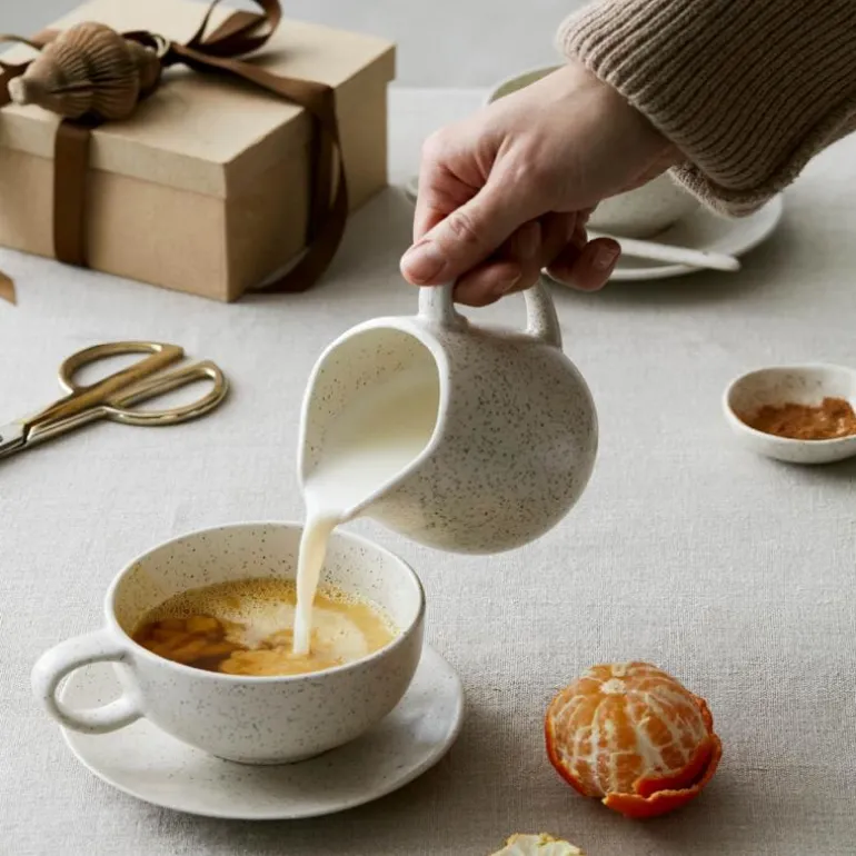 Kopp 25 cl med underskål i Nordic Vanilla serien fra Broste Copenhagen. Bruk koppen alene, eller kombiner den gjerne med de andre servisedelene i den flotte Nordic Vanilla serien. Den kan med fordel også brukes i en herlig avslappet miks av de andre populære serivsene fra Broste Copenhagen. Spettet som vaniljemelk; den glatte, men matte overflaten, med små svarte prikker som minner om vaniljekorn, kjennetegner Nordic Vanilla. En servisekolleksjon, fra Broste Copenhagen som stammer fra de populære nordiske linjer og hengivenhet til vakker glasur og sammenhengende design.Hver del av serviset innehar egenskapene til det skandinaviske designet ved å skape en rolig og innbydende estetikk rundt ethvert måltid. Alle delene i Nordic Vanilla serien er glasert for hånd, og da glasuren reagerer på skiftene under prosessen kan variasjon i farge og form forekomme. Dette gjør ethvert produkt helt unikt. Skap en klassisk borddekning med lyse og luftige off-white nyanser og gi bordet et tidløst rolig uttrykk eller kombiner Nordic Vanilla med deler fra andre serviseserier for en borddekking som føles samlet og kuratert med en unik identitet.