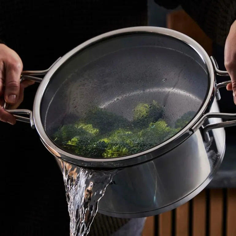 Lokket har også en integrert sil med små hull på den ene siden, perfekt for ris og grønnsaker, og store hull på den andre siden, ideell for pasta. Dampinnsatsen gjør det mulig å dampe mat, som er en sunn måte å tilberede favorittrettene dine på.