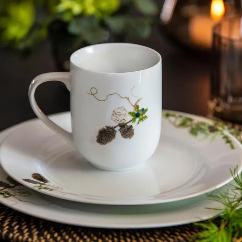 NOSTALGI består av ti deler; gourmettallerken/dekketallerken/fat 31 cm, flat tallerken 27 cm, dyp tallerken 23 cm, frokosttallerken 22 cm, asjett 14 cm, krus 35 cl, müsli/dessert 15 cm, bolle 23 cm, bolle/fat 31 cm og serviettring 4,7 cm. Design og dekor er gjennomført ned til hver minste detalj med et tidløst uttrykk, og er laget av beste ultraboneporselen med slitesterk glasur og høy styrke. Delene kan brukes både i mikrobølgeovn og i oppvaskmaskin.