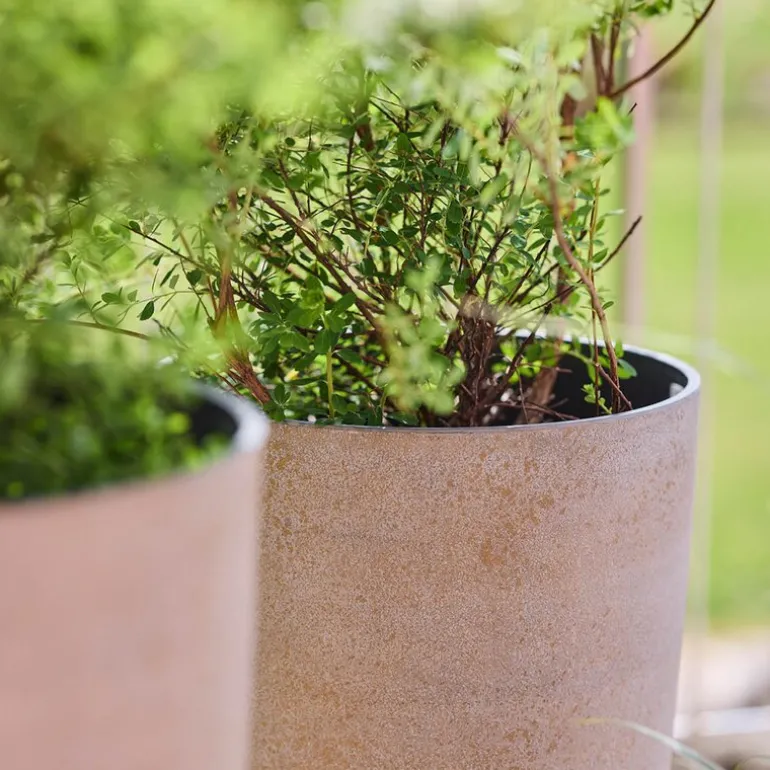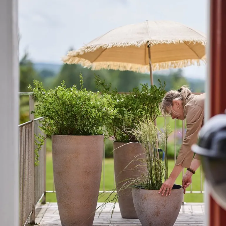 Den matte overflaten og concrete gold-fargen gir potten et elegant og industrielt preg som passer perfekt i uterom eller moderne interiører. Den er utstyrt med dreneringshull som gjør den godt egnet for utendørsbruk. Som en del av Nova-serien kombinerer denne potten tidløs design med praktiske egenskaper.