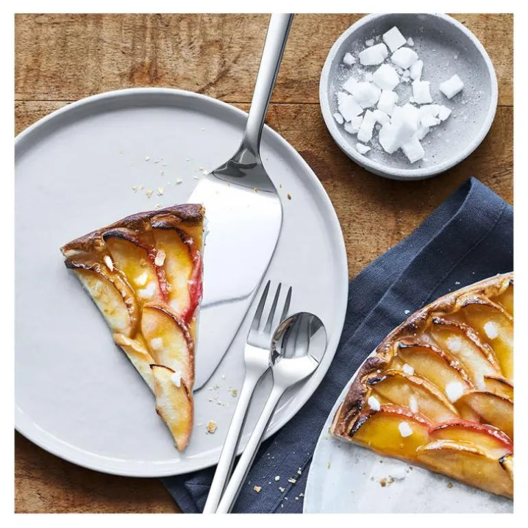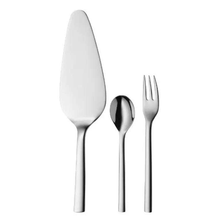 Uansett om kaken består av en luftig krem eller tykk sjokoladeglasur, så skjærer WMF-kakekniven lett gjennom enhver kake, og den kan også brukes til servering. Det lille medlemmet av gaffelfamilien – kakegaffelen – er vanligvis tretannet. Den er ofte laget med en bredere, skrå spiss på venstre side så den kan brukes som en kniv til å dele opp kake, pai eller bakverk. Frukt og desserter kan også spises med kakegaffel. De små gaflene fås separat eller som del av et sett. Alle delene er kombinert i ett sett.