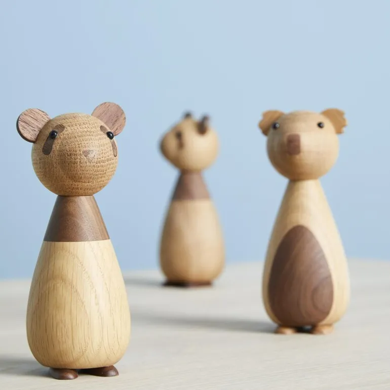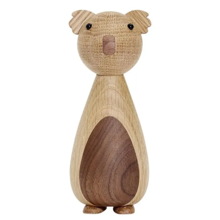 Den søte lille Miss Koala er laget med runde myke former og kantete små ører og er i både eik og valnøtt. Hun står stødig på de små føttene og kan dekorere hjemmet.