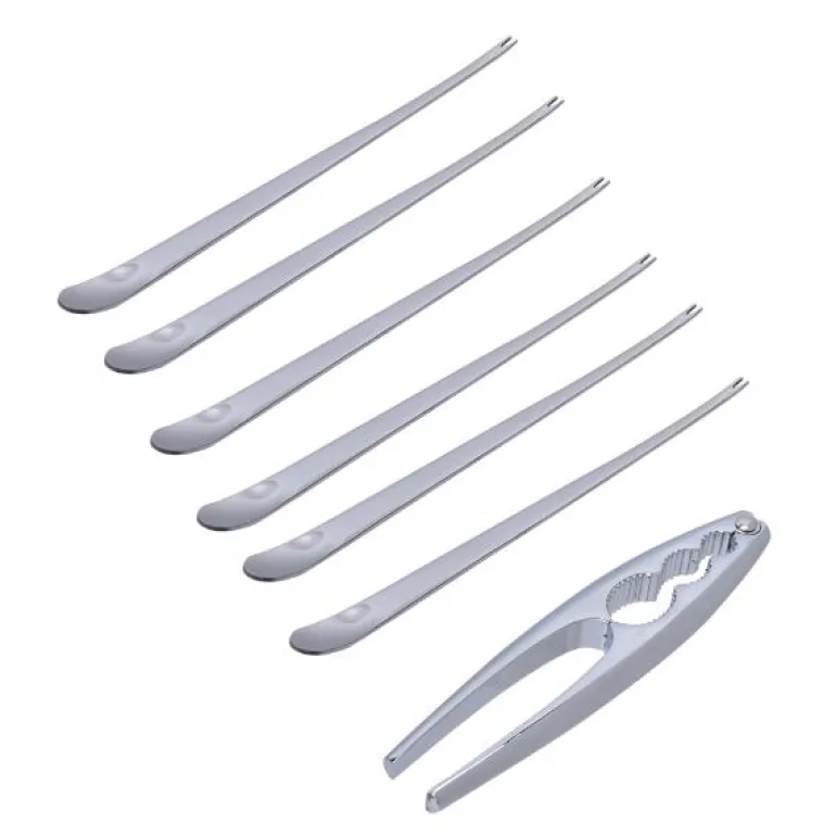 Skalldyrbestikksett i høy kvalitet i blankpolert 18/0 stål. Settet har 7 deler og kommer i fin gavekartong. Settet består av 6 pitlepinner 21 cm lang og en kraftig knekker 17,5 cm lang. Kan rengjøres i oppvaskmaskin. Tørk godt av fuktighet før bestikket legges bort.