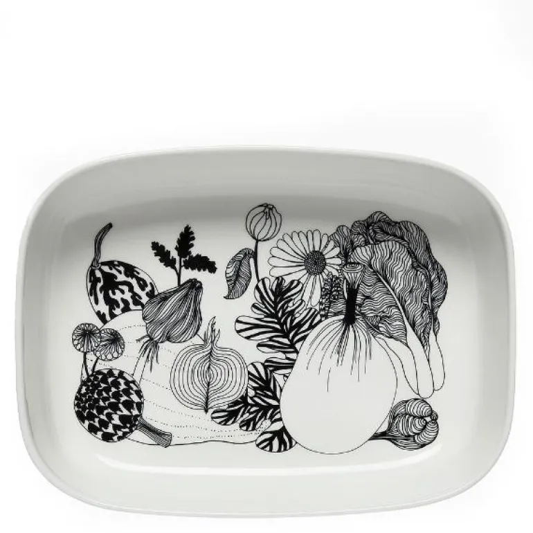 Dette serveringsfatet har den perfekte størrelsen for å servere en fargerik salat, stek eller hvorfor ikke et stort utvalg av kaker til bursdagsfest. Sami Ruotsalainen har designet den elegante fatet, og Maija Louekaris vidunderlige Siirtolapuutarha-mønster dekorerer overflaten. Fatet er laget av hvitt steintøy som tåler oppvaskmaskin, stekeovn, mikrobølgeovn og fryser.
