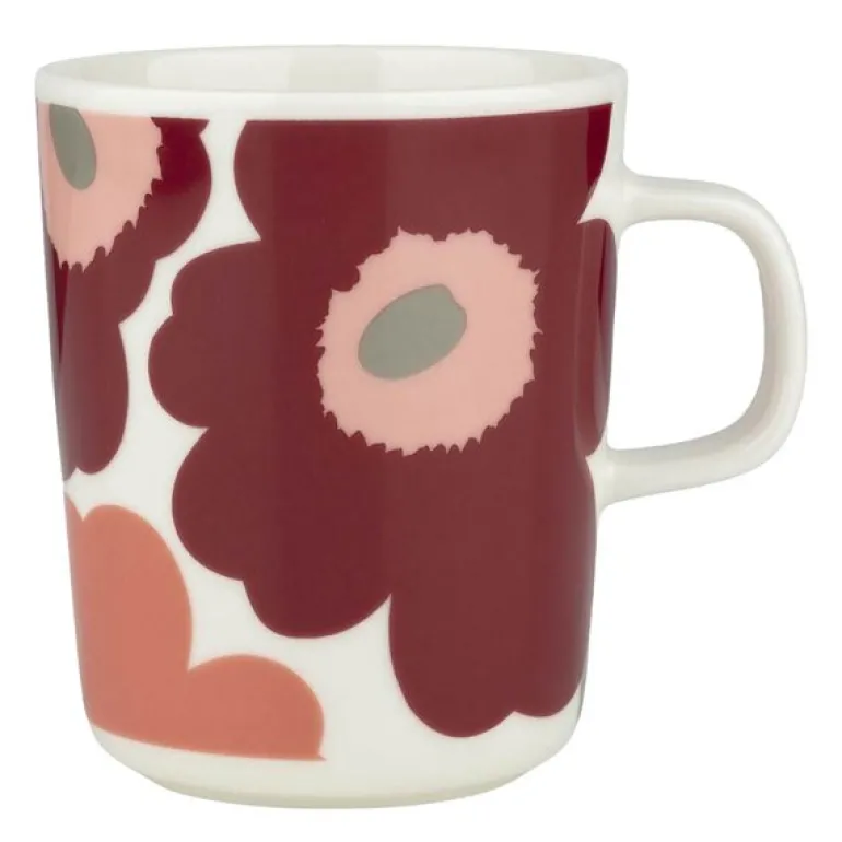 Oiva unikko krus 25 cl hvit/mørk kirsebær/lakserød fra Marimekko er laget av hvit steintøy som tåler oppvaskmaskin, ovn, mikrobølgeovn og fryser.