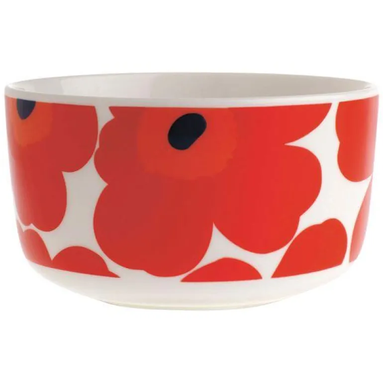 Oiva skål 5 dl i det berømte Unikko mønsteret. Unikko (valmue) symboliserer kreativitet. Mønsteret ble laget i en tid da knapt noen blomstrete mønstre ble inkludert i Marimekkos kolleksjoner. Maija Isola var imidlertid fasinert av blomstertemaet og bestemte seg for å lage et stort utvalgt av nye blomstermønstre i 1964. Et av dem var nå ikoniske Unikko.