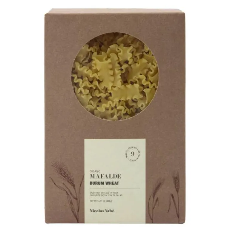 Nicolas Vahé Økologisk Mafalde Pasta på 400g er laget av økologisk durumhvete og er en klassisk pasta med et unikt utseende. De bølgete kantene på mafalde-pastaen gjør at den griper tak i sausen på en smakfull måte, noe som gir retten din en ekstra dimensjon. Perfekt til å heve pastarettene til et høyere nivå med både smak og tekstur.