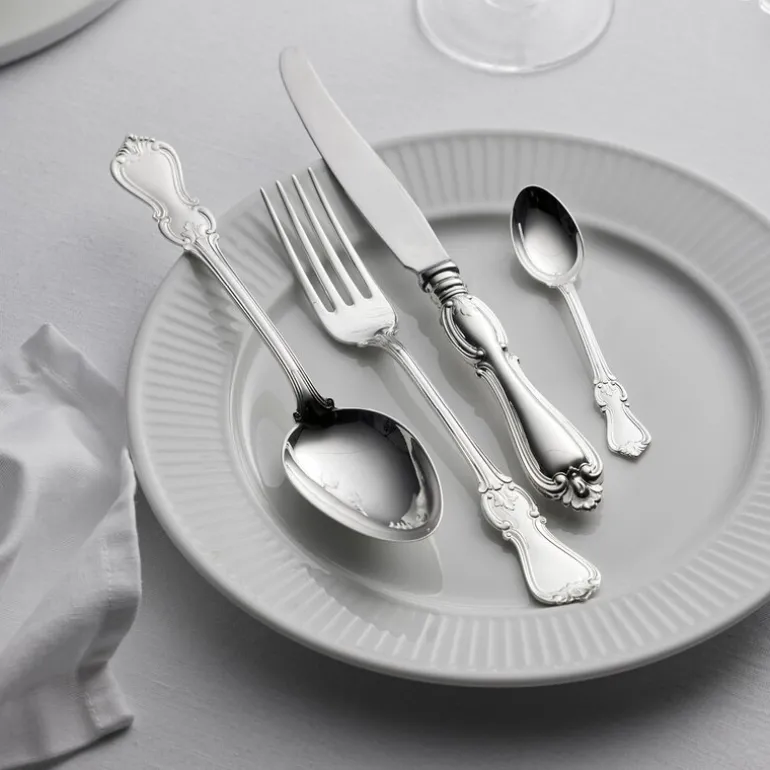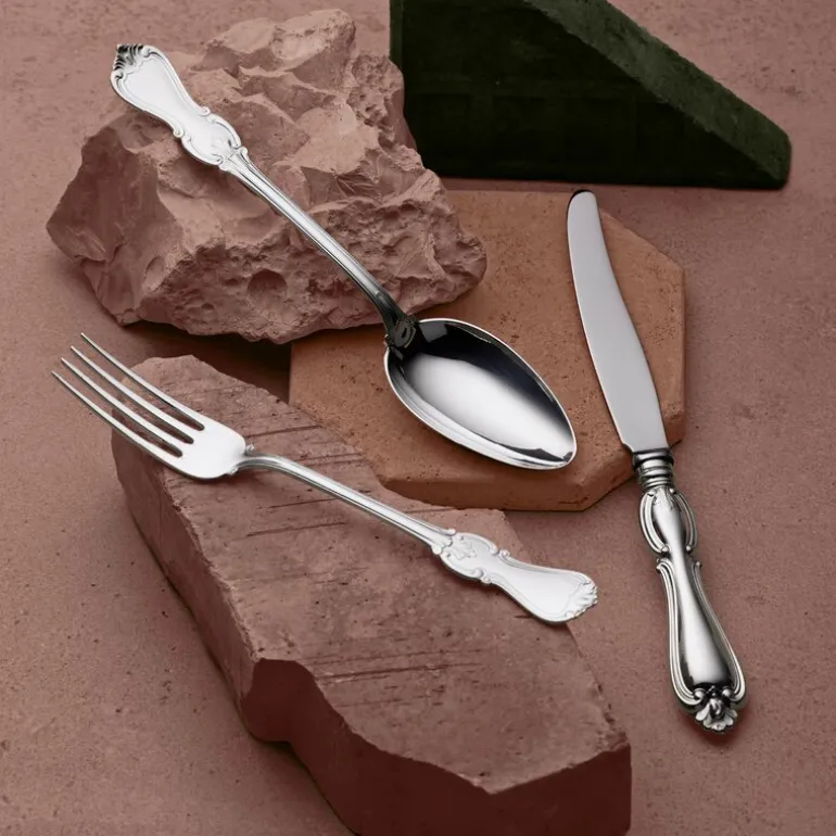 Olga gaffel 20,8 cm 830 fra Gense. Olga har sin opprinnelse i den engelske nyrokokkoen fra 1800-tallet. Bestikket er designet for å passe til den tidens storstilte borddekkinger, med krystallglass og vakkert brettede servietter. Og det gjør seg minst like godt i dag – uavhengig av stil og omgivelser. Med sine levende bladmønstre er det en design som tar form og blir til noe man snakker om rundt bordet. Design: Studio GAB
