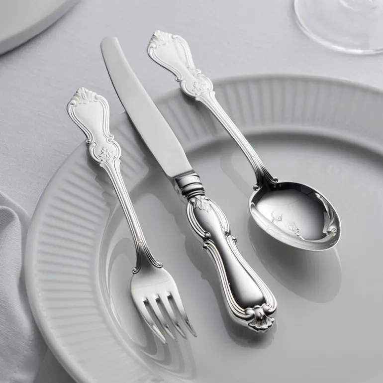 Olga lunsjgaffel 17,8 cm 830 fra Gense. Olga har sin opprinnelse i den engelske nyrokokkoen fra 1800-tallet. Bestikket er designet for å passe til den tidens storstilte borddekkinger, med krystallglass og vakkert brettede servietter. Og det gjør seg minst like godt i dag – uavhengig av stil og omgivelser. Med sine levende bladmønstre er det en design som tar form og blir til noe man snakker om rundt bordet. Design: Studio GAB