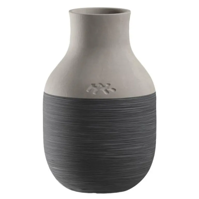 I likhet med de to andre vasene i serien har den lille vasen på 12,5 cm en elegant todelt design med en rå topp i en naturlig gråtone som har tatt farge etter de resirkulerte materialene, og en håndmalt antrasittgrå nyanse som legger seg vakkert på den nedre halvdelen av vasene og skaper tyngde og kontrast. Alle delene i Omaggio-serien er designet for å passe sammen. Det skapes et interessant og dekorativt uttrykk når de nye Omaggio Circulare-vasene settes sammen med andre Omaggio-vaser, blomsterpotter og lysestaker i forskjellige størrelser og farger – noen kanskje helt uten blomster, planter og lys slik at designens skulpturelle linjer kan tale for seg selv.