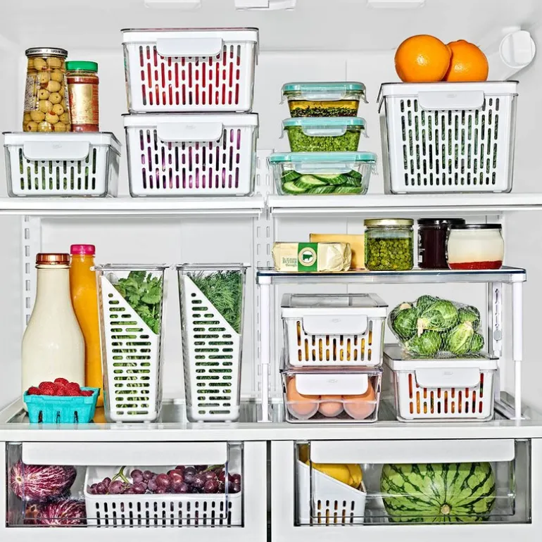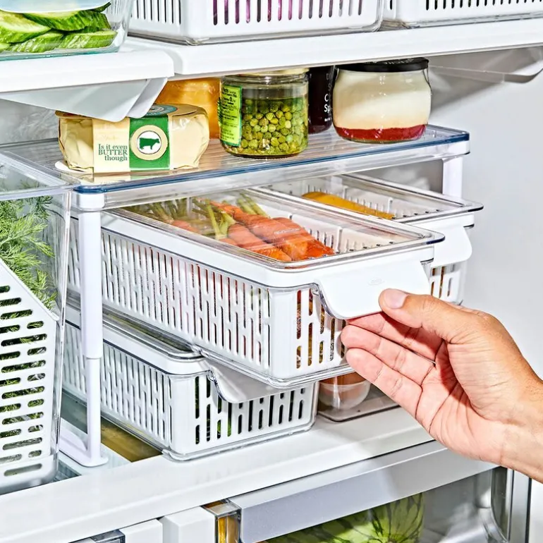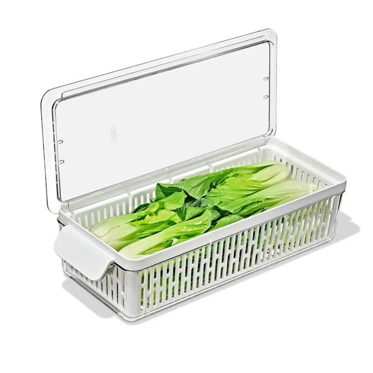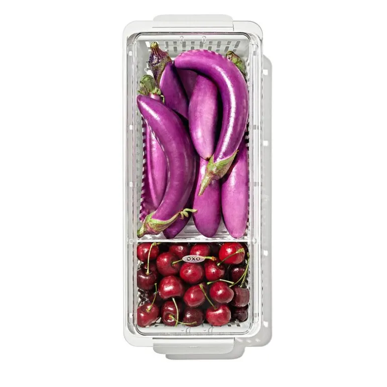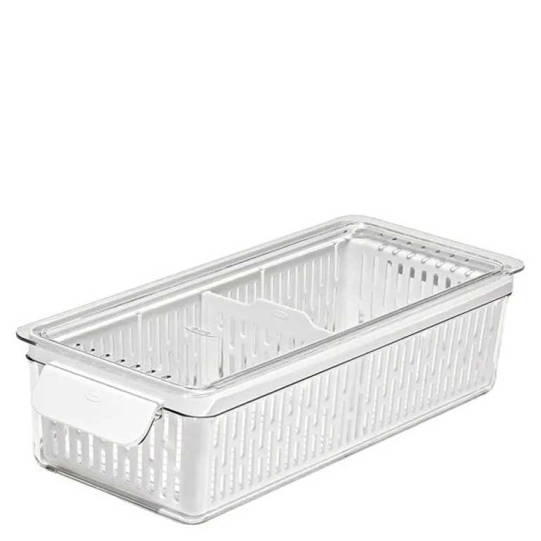 Den lange oppbevaringsboksen til kjøleskap fra OXO 37×9,5 cm i klar og hvit plast er ideell for oppbevaring av grønnsaker som gulrøtter, agurker, aubergine, selleri og spisskål. Med justerbar skillevegg holder du grønnsakene oversiktlige og organisert, noe som bidrar til å redusere matsvinn.