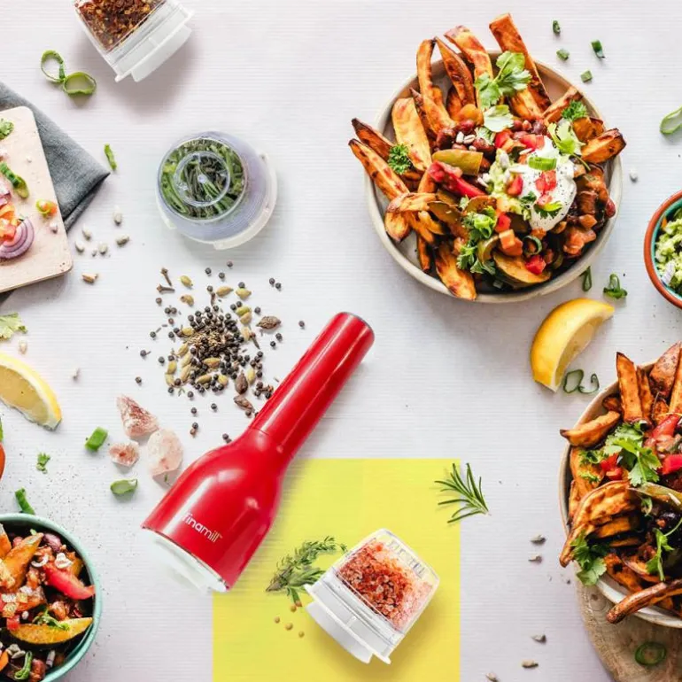 FinaMill oppladbar krydderkvern med to FinaPod pro plus i fargen sangria.