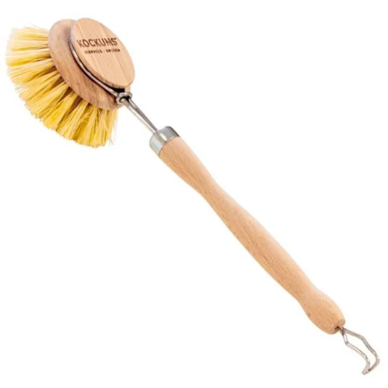 Oppvaskbørste i bøketre fra Kockums. Denne oppvaskbørsten har en bustbørste som renser effektivt uten å lage riper. Hver oppvaskbørste er unik på grunn av de naturlige variasjonene i bøkeveden, og børstehodet kan byttes ut om nødvendig. Børsten tar vare på oppvasken skånsomt og kan henges opp med opphengskroken når den ikke er i bruk.