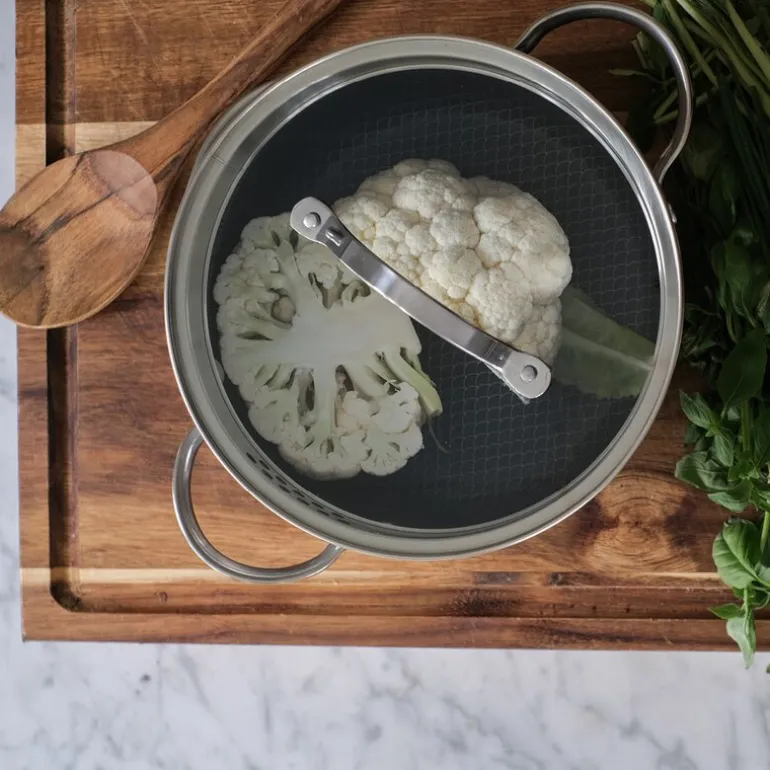 Serien har en hel induksjonssokkel laget av aluminium og stål, som sikrer jevn oppvarming. Optimal er tilgjengelig både med og uten non-stick belegg, som lar deg kombinere og sette sammen dine favoritter. Kan vaskes i oppvaskmaskin og kan brukes på alle kokeplater og i ovn opp til 260°C. Følelsen av kontroll. Smaken av suksess.