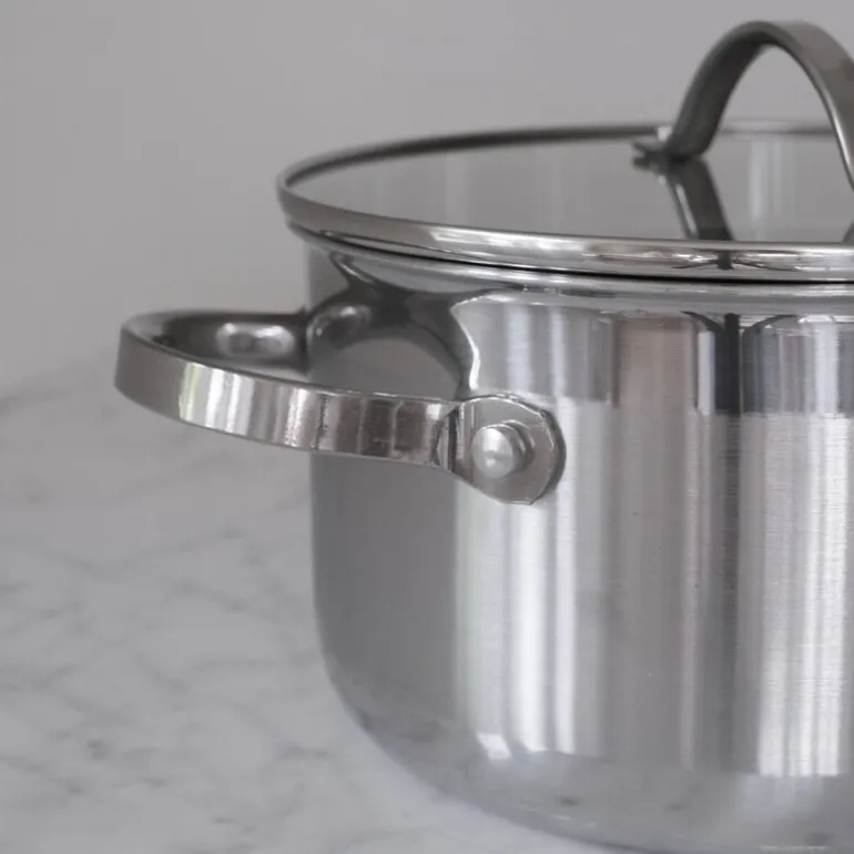 Grytene har en induksjonsbunn på 2,6 mm og aluminiumsvegger som leder varme optimalt -0,5 mm 18/8 stål -1,5 mm aluminium -0,6 mm 18/0 stål Grytene har en 3-lags slagbunn på 2, 6 mm som strekker seg fra bunn til topp. Stekepannen har 2,6 mm vegg, og en tykkbunnet og solid induksjonsbunn på 7,6 mm som beholder sin stabile form.