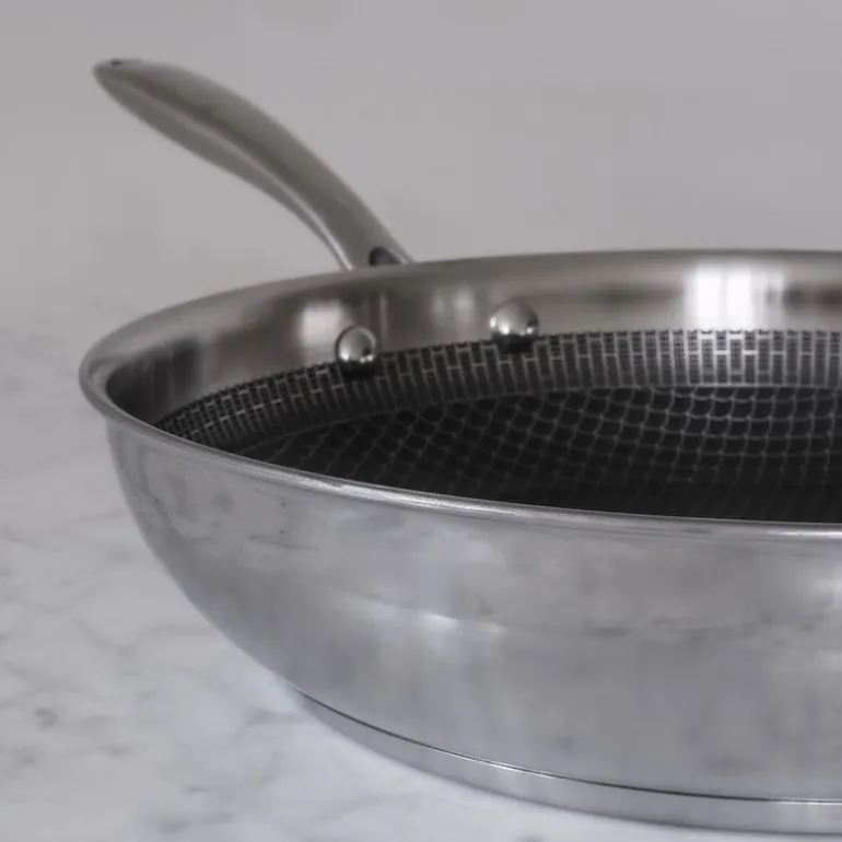 Stekepannen har en 7,6 mm induksjonsbunn og aluminiumsvegger som gir rask og jevn varmefordeling. Pannen er laget med flere lag materialer for optimal ytelse: 0,6 mm 18/0 stål, 1,5 mm aluminium, 0,5 mm 18/0 stål, og 2 lag med G7 keramisk belegg. Med en 2,6 mm veggtykkelse og den solide induksjonsbunnen sikrer stekepannen stabilitet og opprettholder sin form under bruk.