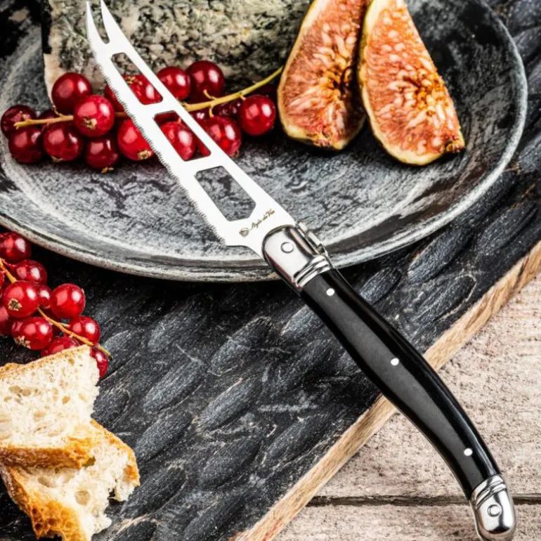 Laguiole Premium Line ostekniv i svart kombinerer funksjonelt design med stilren utførelse. Det åpne bladet med hull sørger for at osten ikke klistrer seg fast, og gaffelspissen gjør det enkelt å løfte ostebitene over på tallerkenen.