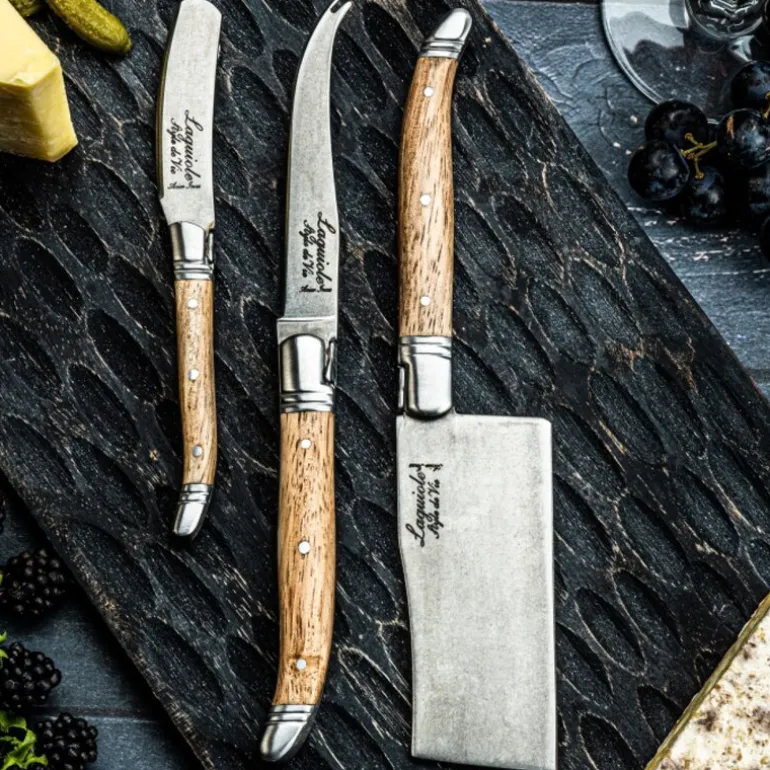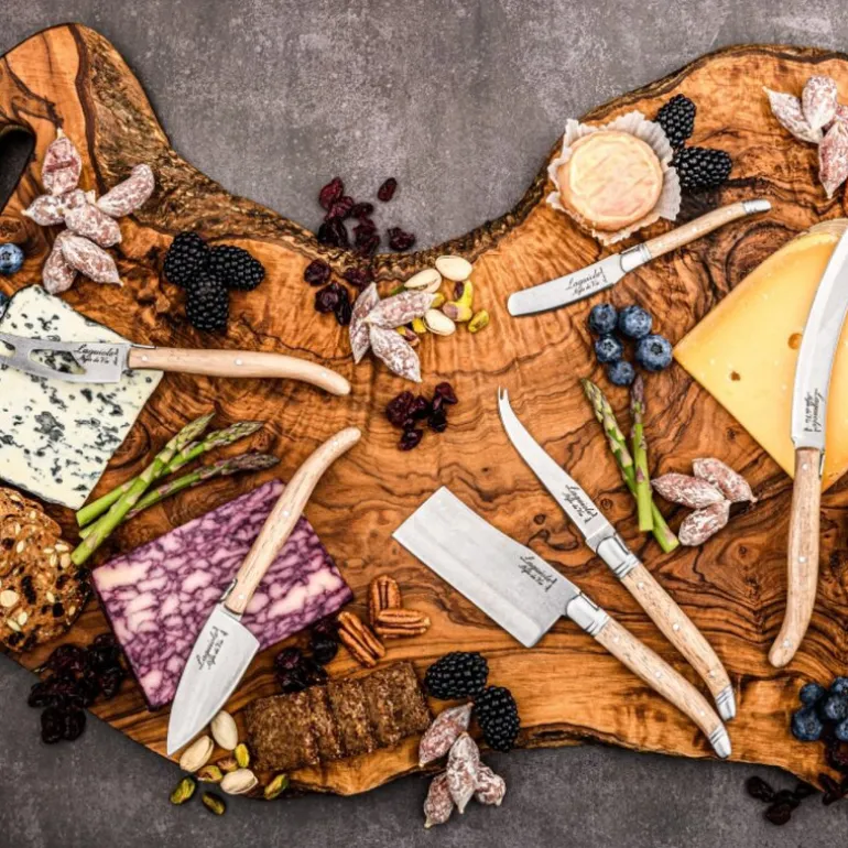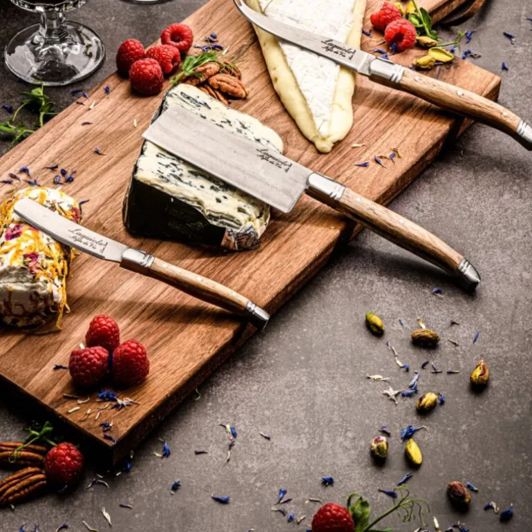 Laguiole Style de Vie presenterer et osteknivsett der håndverket virkelig kommer til uttrykk. De solide bladene på 2,5 mm kombinert med oliventre gir både tyngde og raffinement. Dette settet er ikke bare et funksjonelt serveringsverktøy, men også en dekorativ detalj som hever borddekkingen.
