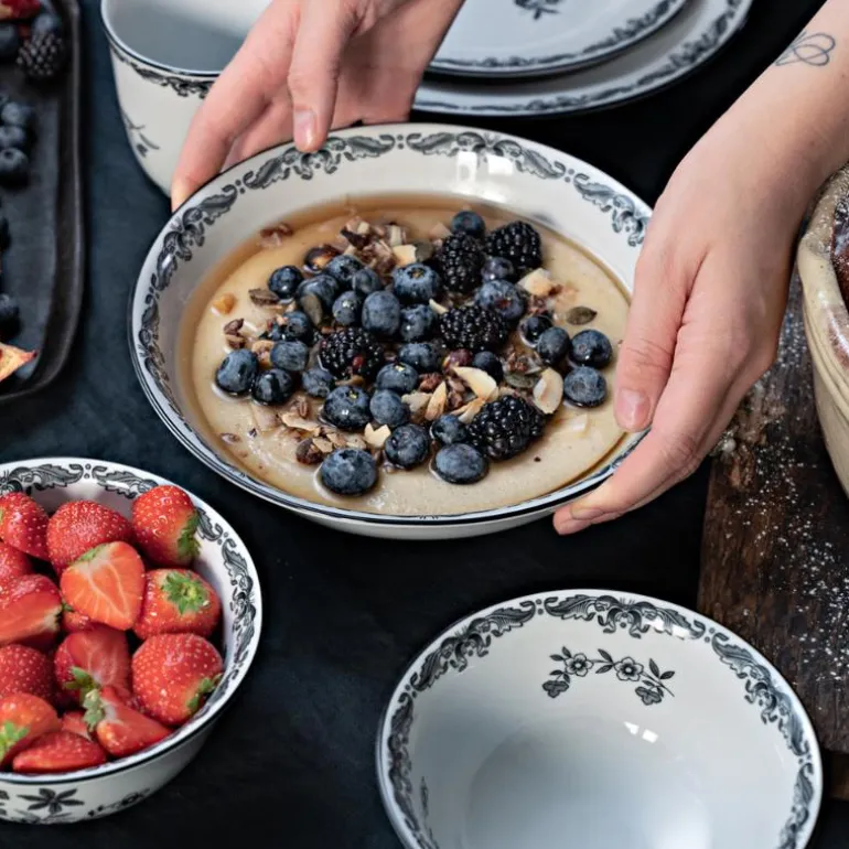 Den dype tallerkenen fra Ostindia Svart er en elegant tallerken for servering av supper. Bruk den svarte tallerkenen for å skape en sanselig hverdagsluksus. Ostindia er det nest eldste porselenet hos Rörstrand og fortsetter sin reise i svart med deler å elske og kombinere.