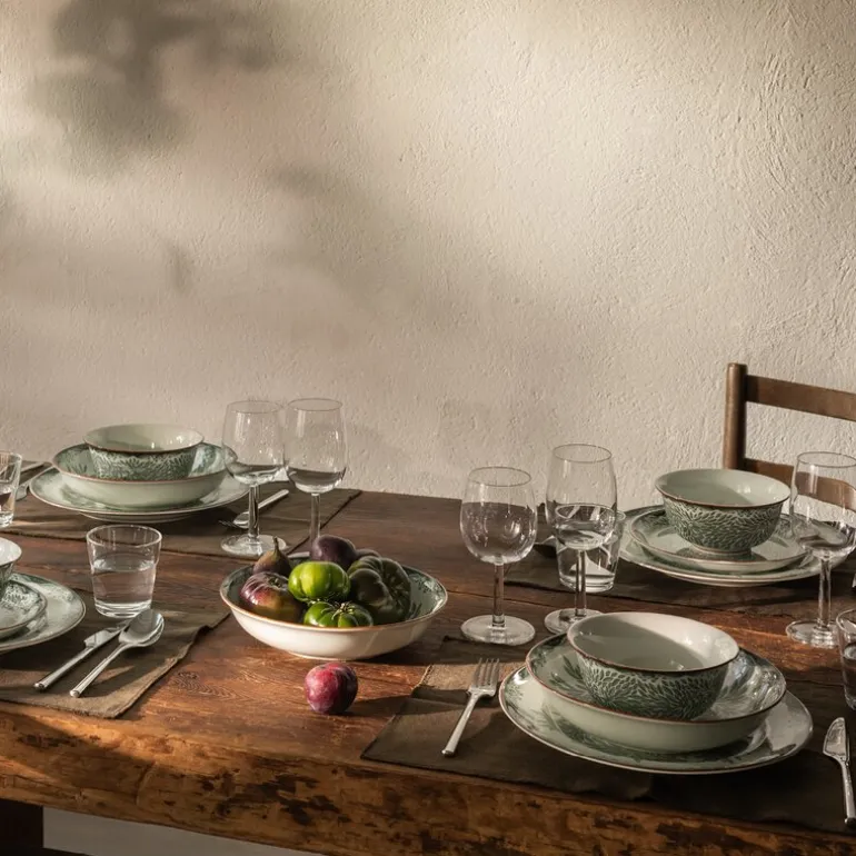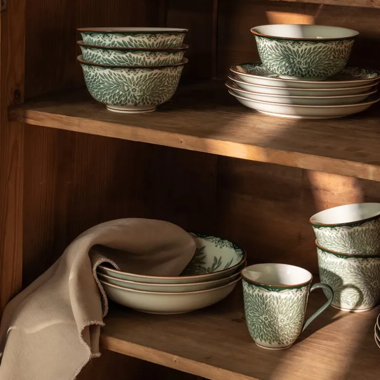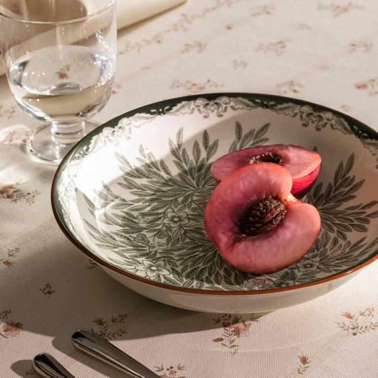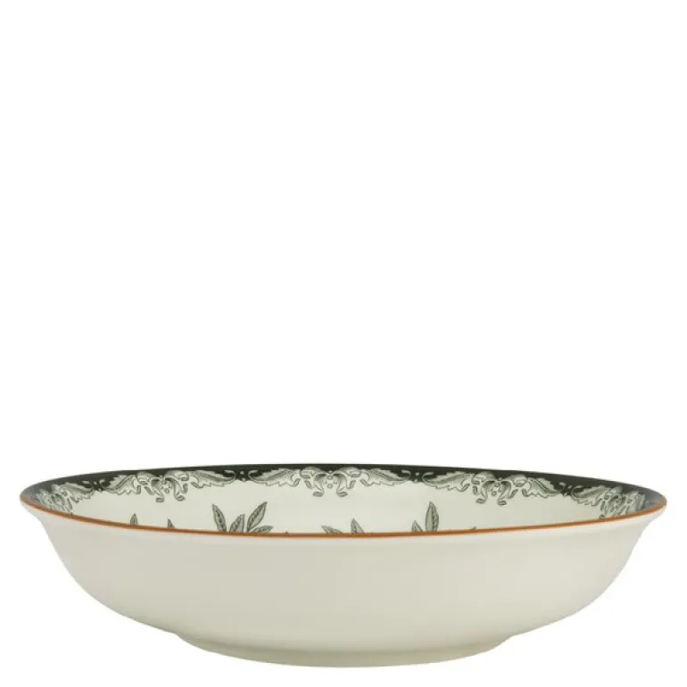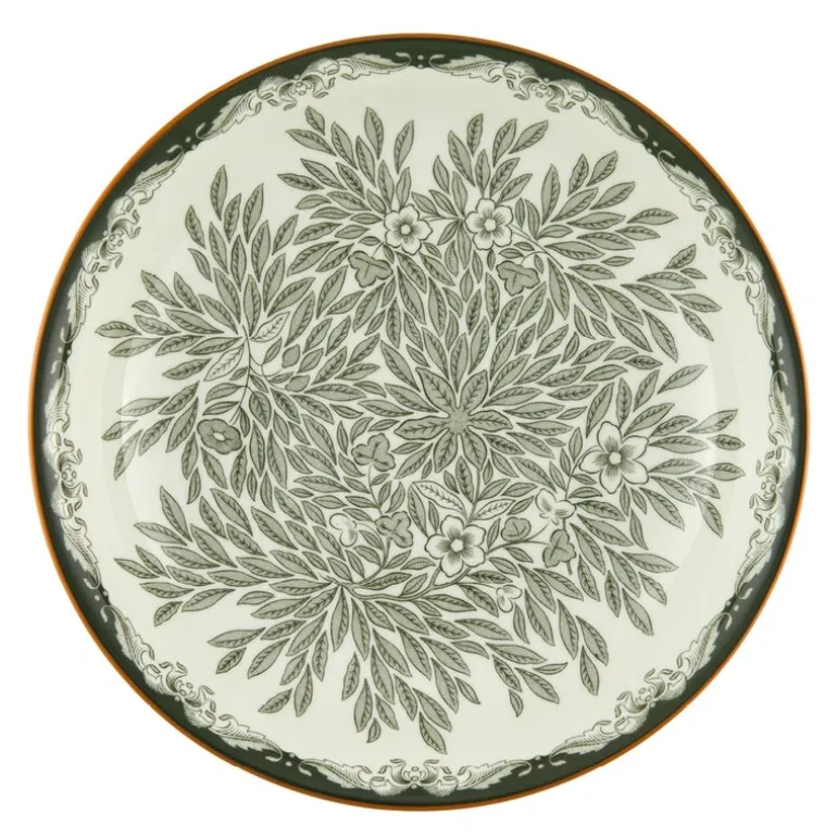 Ostindia Floris dyp tallerken 22 cm grønn fra Rörstrand. Ostindia Floris dyp tallerken (22 cm), med sitt fengslende grønne mønster, er det dristige og karismatiske motstykket til den klassiske Ostindia, noe som gjør den til et fortryllende valg for servering av supper eller salater. Dens slående design vil heve matopplevelsen din og legge til et snev av vill eleganse til dine kulinariske kreasjoner.