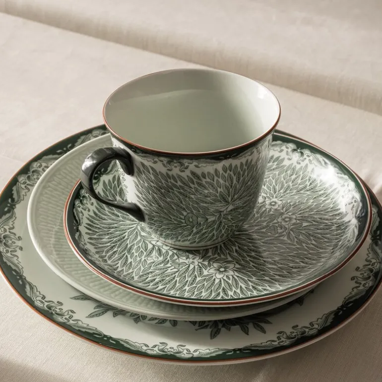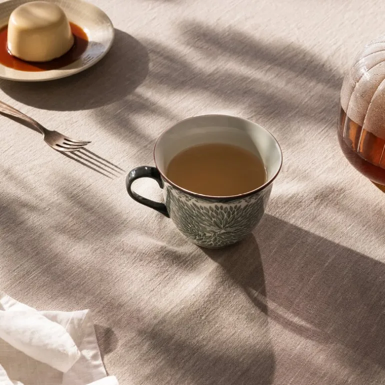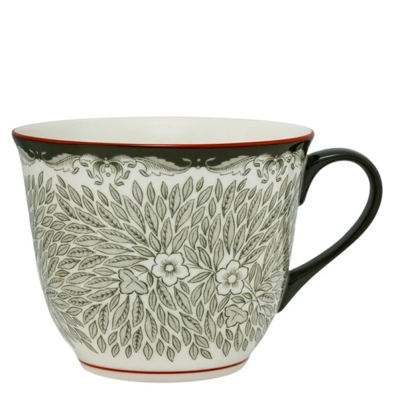 Ostindia Floris krus 40 cl grønn fra Rörstrand. Ostindia Floris-kruset (40cl) dekker et dristig bord med sitt fortryllende grønne bladverksmønster, der det dristige bladverket vikler seg grasiøst rundt kruset. Dette elegante kruset er perfekt for servering av te, latte eller varm sjokolade. Ostindia Floris er et fengslende valg for borddekking.