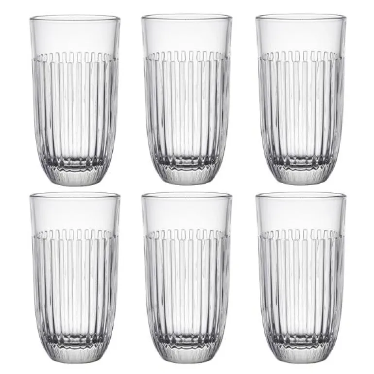 Seks longdrinkglass i serien Ouessant, fra franske La Rochère. Ribbet glass som gir et elegant, men enkelt inntrykk. Glasset rommer 45 cl og passer til kalde drikker som øl, iste og cocktailer.