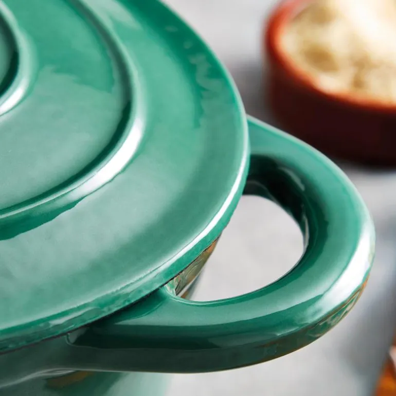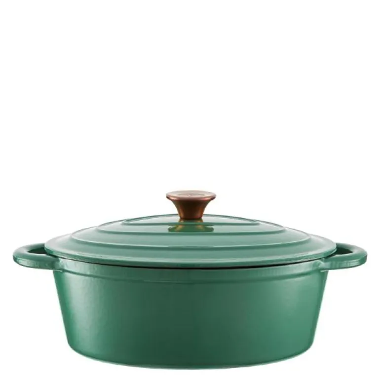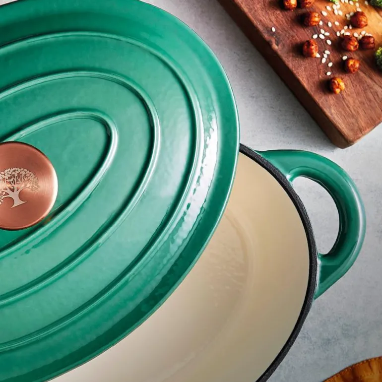 Oval støpejernsgryte på 29 cm/3 L i fargen grønn fra Barbary & Oak er laget av høykvalitets støpejern som effektivt holder på varmen, noe som gjør den ideell for å tilberede deilige gryteretter for hele familien. Den emaljerte overflaten hindrer at maten setter seg fast og gjør gryten enkel å rengjøre, samtidig som den ikke absorberer lukt eller smak.
