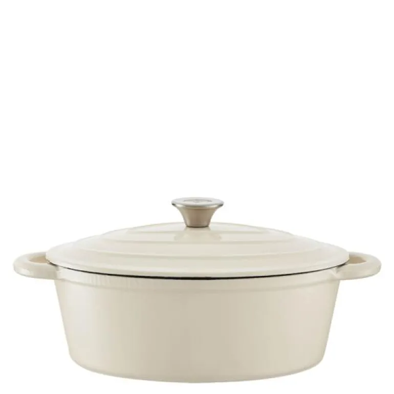 Støpejernsgryte i oval form på 29 cm/3 L i fargen Creme fra Barbary & Oak er laget med høykvalitets støpejern som effektivt holder på varmen, noe som gjør den ideell for å lage deilige gryteretter for hele familien. Den emaljerte overflaten hindrer at maten setter seg fast og gjør gryten enkel å rengjøre, samtidig som den ikke absorberer lukt eller smak.