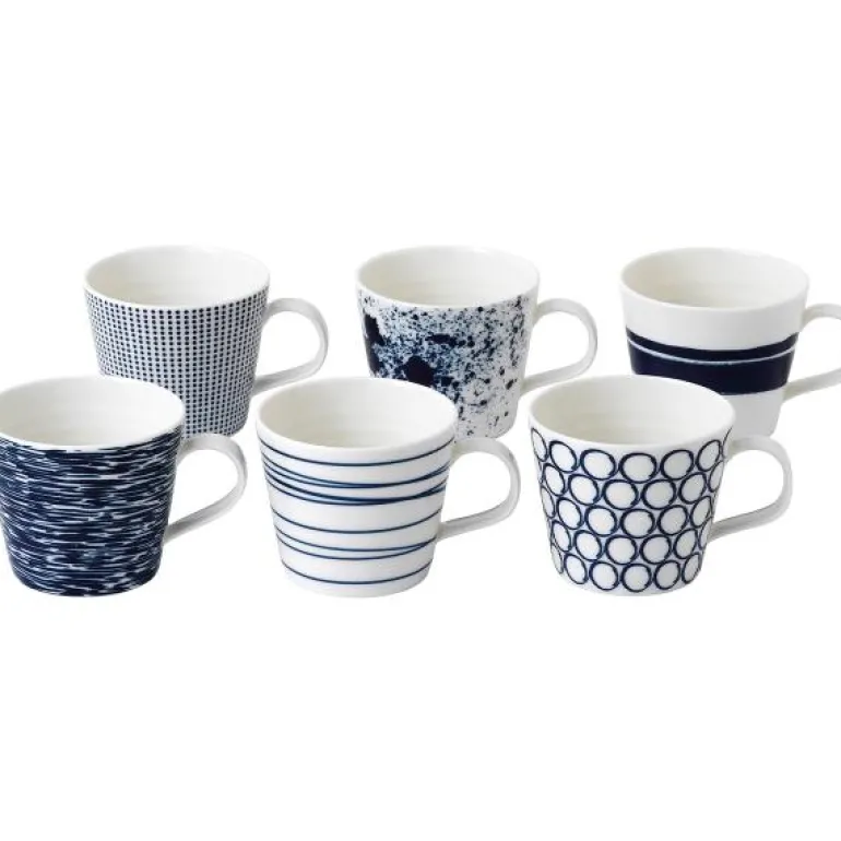 Pacific Small Mugs S/6 280ml/0.5pt. Nyt dine varme favorittdrikker med stil med dette Pacific krussettet i porselen. Med seks slående design inspirert av havet, kan du bestemme om prikker, linjer, pensel, sprut, sirkler eller tekstur er din favoritt. Den moderne, friske og trendy Pacific Blue-fargepaletten er designet for å mikse og matche med den nye Pacific Mint-serien. Del en te eller kaffe med familie og venner med disse 280 ml krusene.