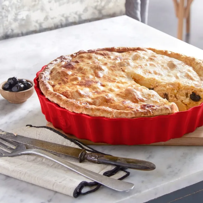 Emile Henrys paiform på 28 cm i rødfarge er et elegant valg for å lage perfekte paier og terter. Med høye sider, delikate kurver og en flat bunn som forenkler rengjøringen, er denne formen både funksjonell og stilfull. Laget av keramikk med høy motstand, tåler den temperaturer fra -20 til 270 grader og passer i både stekeovn og mikrobølgeovn. Den kan vaskes i oppvaskmaskin, og kommer med Emile Henrys 10-års garanti. Produsert i Frankrike, er dette en form som tilfører klasse og kvalitet til enhver matlaging.